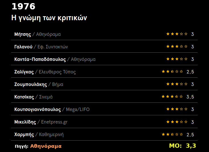 H ηθοποιός Μανουέλα Μαρτέλι, στην πρώτη της μεγάλου μήκους ταινία, την οποία, όπως λέει εμπνεύστηκε από την γιαγιά της και το μυστήριο που την περιέβαλε, αναπαριστά ευλαβικά την εποχή και το αγωνιώδες κλίμα παράνοιας που τη συνοδεύει, για να δημιουργήσει ένα βραδυφλεγές πολιτικό θρίλερ, όπου μια απροσδιόριστη αίσθηση απειλής παραμονεύει σε κάθε πλάνο του. Ταυτόχρονα όμως, το 1976 είναι και μια γυναικεία ταινία σπάνιας ευαισθησίας: θύμα της πατριαρχικής εποχής της, η ηρωίδα, μια δυναμική και γοητευτική γυναίκα, έχει θυσιάσει τις ικανότητές της, ζώντας μια ζωή στο περιθώριο της καριέρας του ιατρού συζύγου της και περιοριζόμενη στις οικογενειακές υποχρεώσεις. Καθώς καλείται να σώσει έναν άνθρωπο από τον θάνατο, «παίζοντας» με τη φωτιά και ρισκάροντας τα πάντα, αρχίζει να ανακαλύπτει τον εαυτό της… «Το 1976 ήταν μια από τις πιο σκληρές χρονιές της Δικτατορίας του Πινοσέτ», σημειώνει η νεαρή σηνοθέτης. «Στην οικογένειά μου θεωρούσαν πως την εποχή εκείνη η γιαγιά μου είχε κατάθλιψη, αλλά σκέφτηκα πως δεν είναι δυνατόν να πιστεύουμε πως όσα γίνονται έξω από τους τοίχους του σπιτιού μας δεν παρεισφρέουν στον ιδιωτικό μας χώρο… Αναρωτήθηκα: ποιοι είναι οι μηχανισμοί που μας επιτρέπουν να συνεχίζουμε να ζούμε τις ζωές μας, όταν εκεί έξω κάποιοι πετάνε τους συμπολίτες μας στη θάλασσα;». Ταινία με χιτσκοκικές αποχρώσεις, το 1976, μέσα από μια λιτή αλλά φροντισμένη σκηνοθεσία, δημιουργεί στον θεατή την αίσθηση πως η Χιλή του Πινοσέτ είναι μια χώρα όπου οι ρουφιάνοι παραμονεύουν παντού: μια χώρα σε ασφυξία, όπου άνθρωποι που αντιστέκονται εξαφανίζονται εν ριπή οφθαλμού, και οι υπόλοιποι απλώς επιβιώνουν, έντρομοι για το τι μπορεί να τους συμβεί. Μια χώρα όπου ακόμα και τα αντιβιοτικά χορηγούνται με έγκριση, ώστε να εντοπίζονται οι αντιφρονούντες.